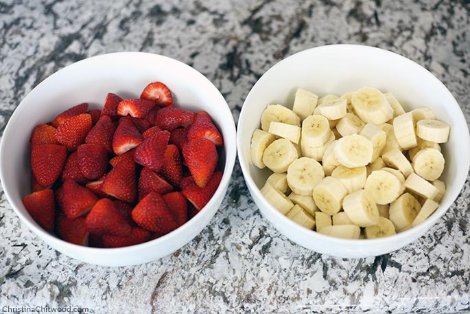 Here are the healthy ingredients: organic strawberries and organic bananas. Wash the strawberries, cut the tops off the strawberries, and cut them in half. Cut the bananas into approximately 1-inch thick slices.