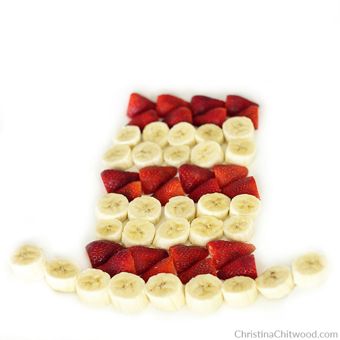 Place the strawberries onto a plate with one row facing one way and the second row facing the other way. This provides good tessellation (one of my husband’s favorite things!) and makes for a neat-looking stripe. The hat is made up of the colors from top to bottom: red, white, red, white, red, and a white rim. Each colored stripe is made using two rows of the fruit (for example, two rows of sliced strawberries and two rows of sliced bananas). The rim is one row of bananas going a little wider than the rest of the hat.