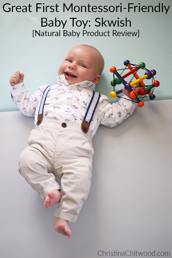 I’m so glad we had this Montessori-friendly toy from the beginning! It is awesome for babies when they first start using toys and during their first year. I’m sharing what I love, don’t love, and my full review of the Skwish baby toy.