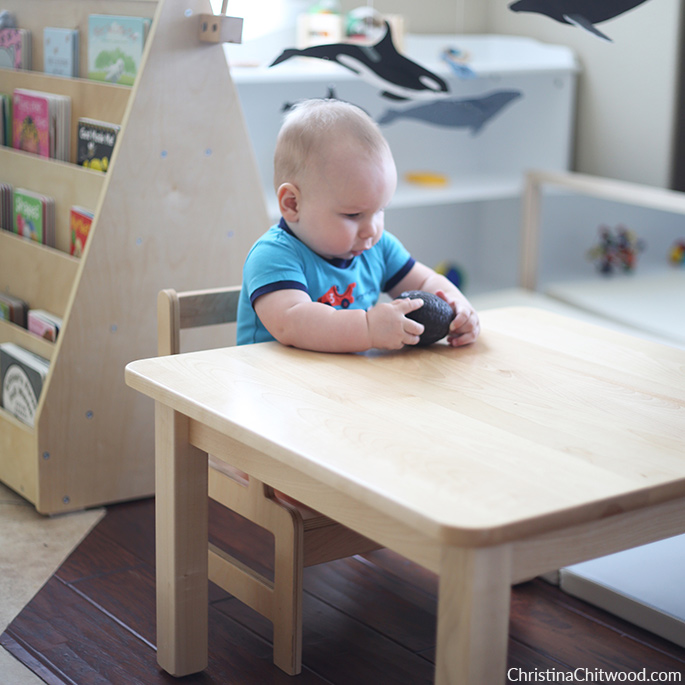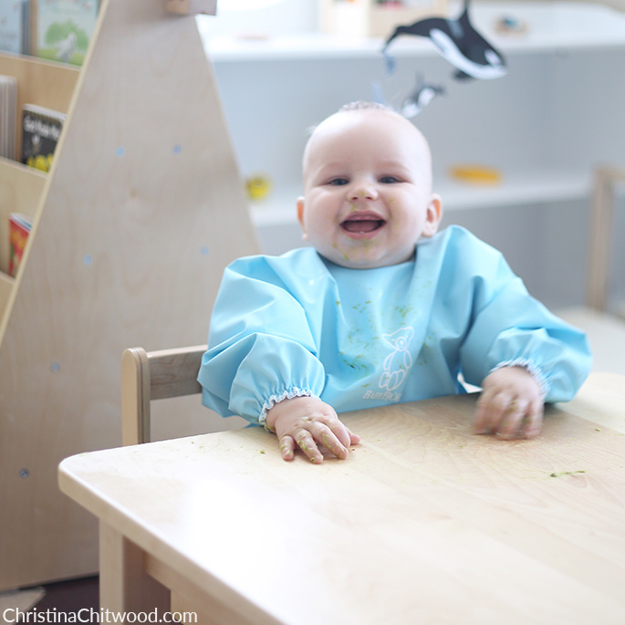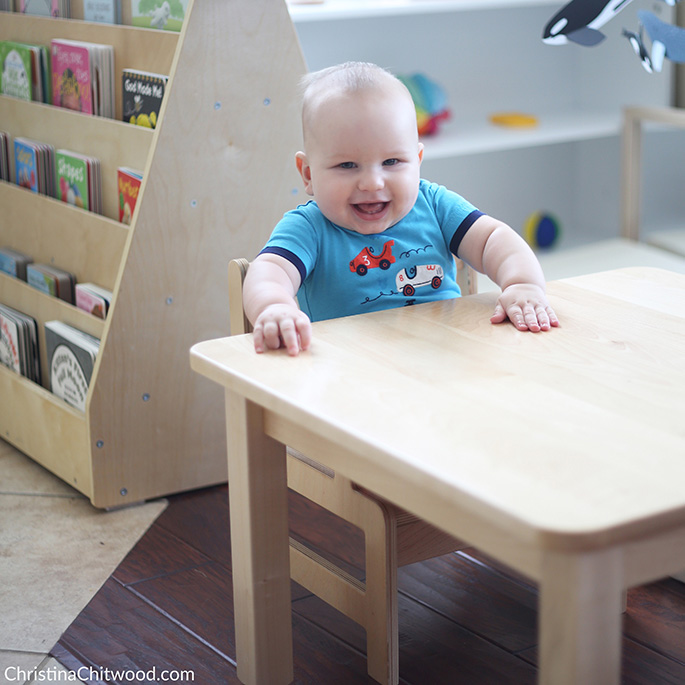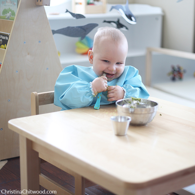 We got our weaning table from Michael Olaf because we like that the first chair is weighted and cannot be pushed in too far if a sibling, cousin, or older child wants to push the baby’s chair in. This ECR4Kids Natural Bentwood Multipurpose Kids Table and Chair Set looks great, too, and I like how they can be used as tables, chairs, stools, or shelves. It’s so nice to have a child-sized table and chairs for a baby or toddler to eat, work (play), and be independent at. Here are more weaning table and chair options.