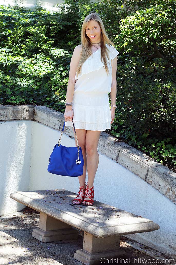 The second white summer dress option is with a blue handbag and red flat sandals! This option is great for any time you want to wear red, white, and blue, feel patriotic, or for Labor Day this year or the 4th of July any year!