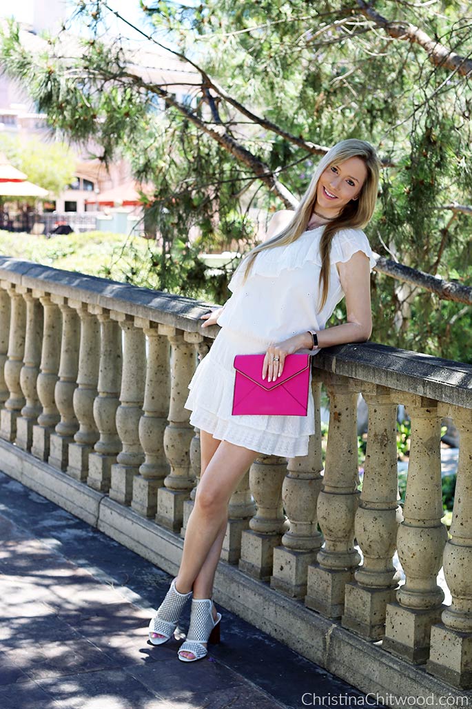 The third white summer dress option is with a bright pop of color using a bright pink clutch! Of course, you can substitute any bright-colored clutch or handbag.