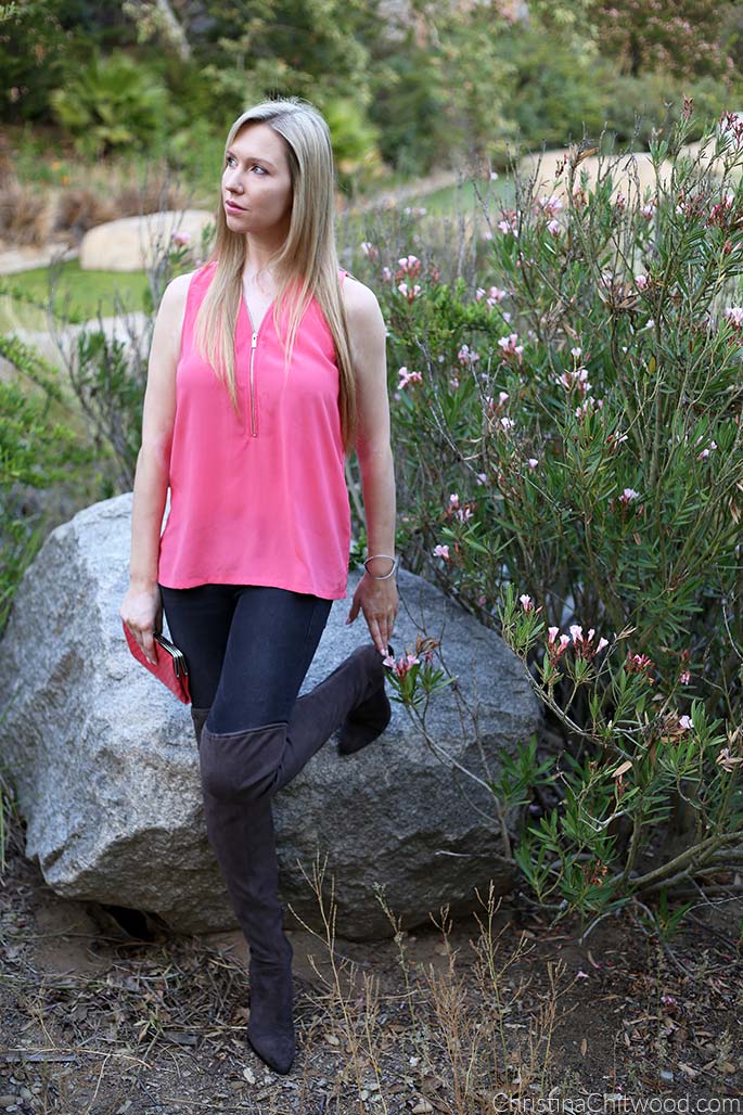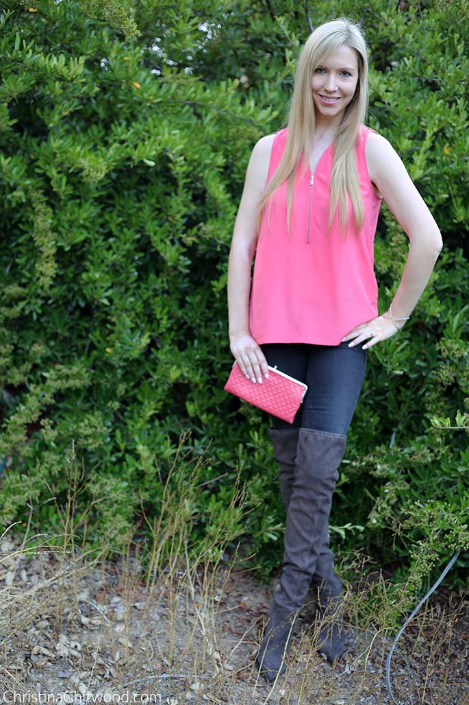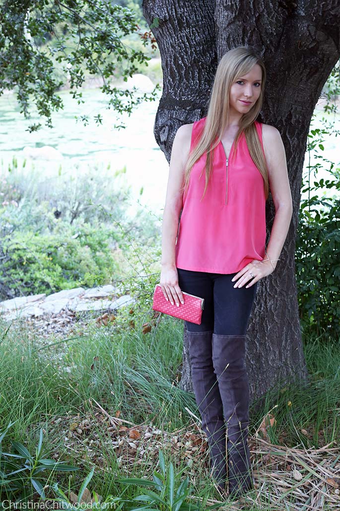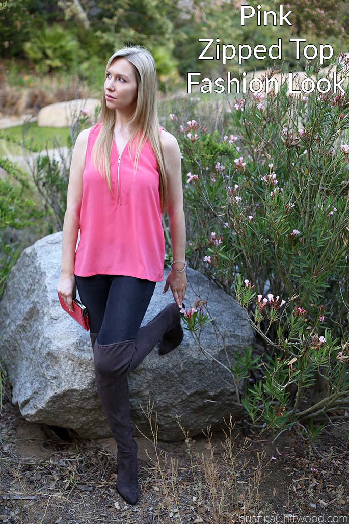 The silk on this top makes it hang in a pretty way and dresses the top up a bit. This top is slightly edgy with the zipper on the front. The sleeveless is perfect for summer but can easily work great for fall paired with a cropped denim jacket. It’s a pretty color. Of course, I love anything pink! If you’re pregnant, this top will work with a bump, although it’s not a maternity top.