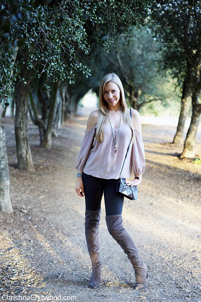 My favorite parts of this outfit are the feminine silk cold-shoulder top, pretty colors, awesome skinny jeans, fabulous over-the-knee boots, and stylish crossbody handbag!