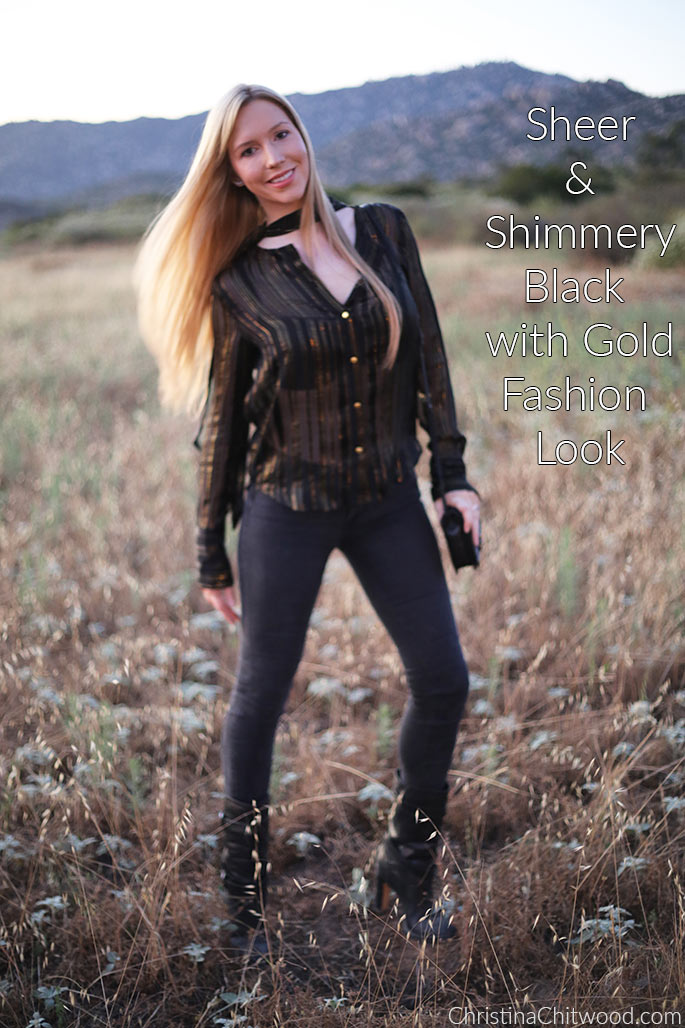 Are you a fan of tops that tie at the neck? Do you like outfits that have some sheer or shimmer? This black and gold fashion look is pretty and sexy. I provide two ways of wearing this top … one being more conservative.Sheer and Shimmery Black with Gold Fashion LookLook modeled by me, Christina Chitwood. Photos taken by my husband, Tom Parkin. Photoshoot in San Diego, California.