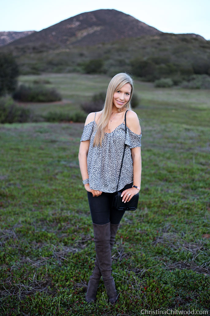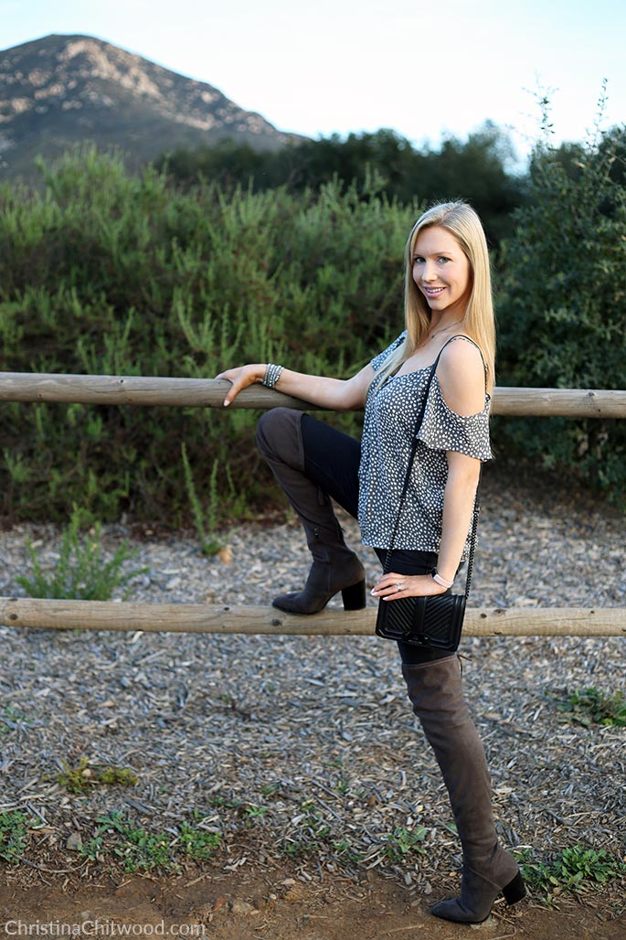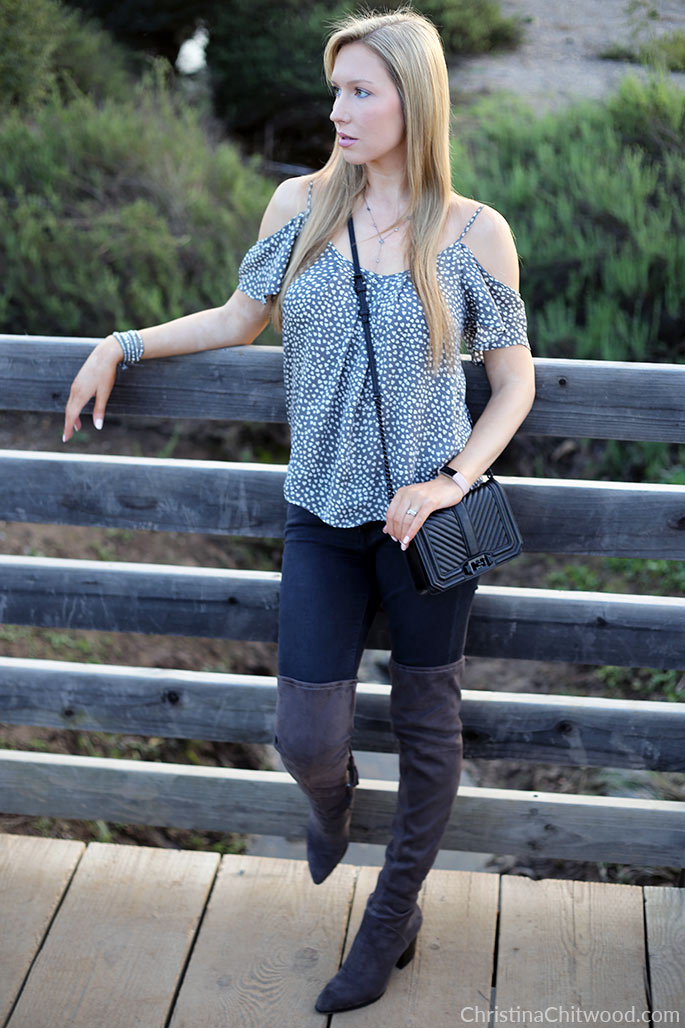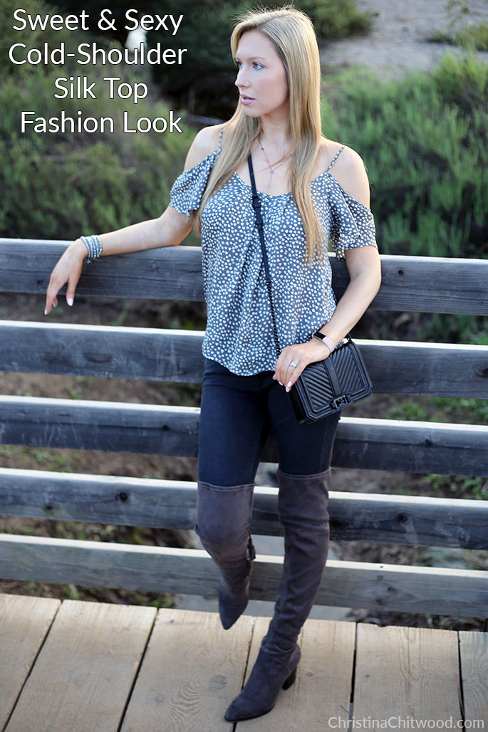 My favorite parts of this outfit are the silk cold-shoulder top with hearts, awesome skinny jeans, fabulous over-the-knee boots, stylish crossbody handbag, and the combination of sweet & sexy.